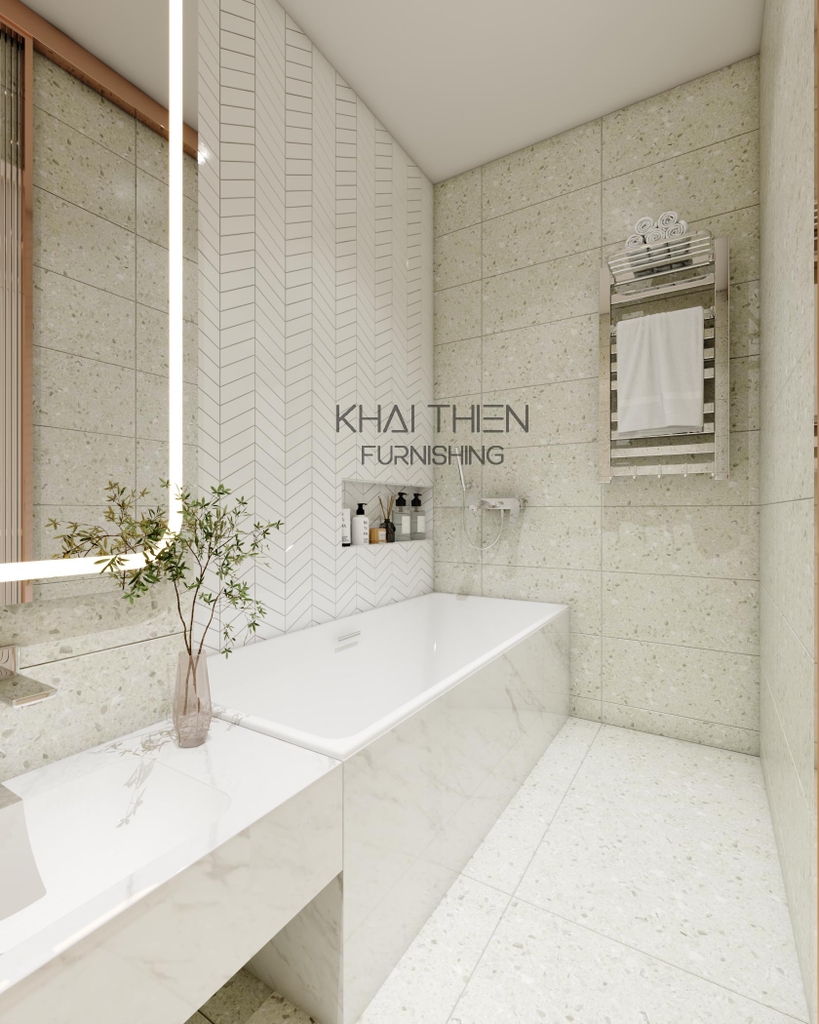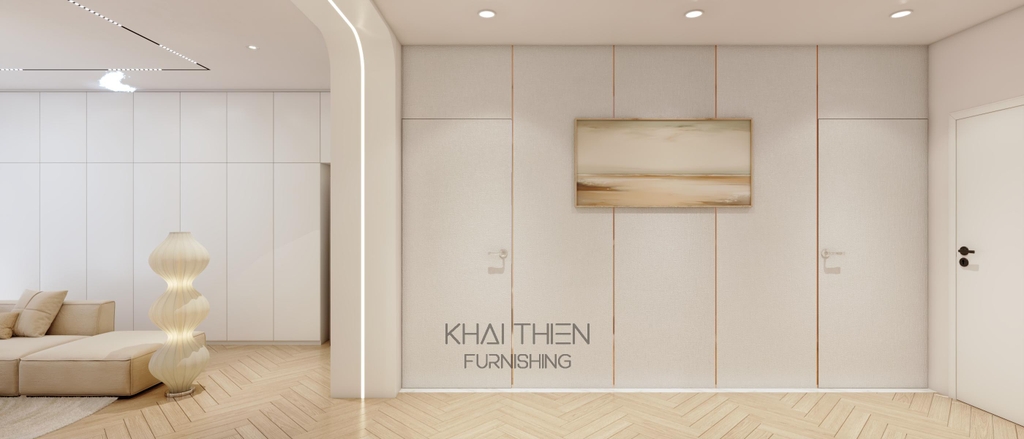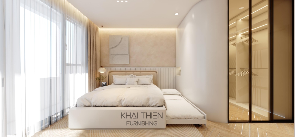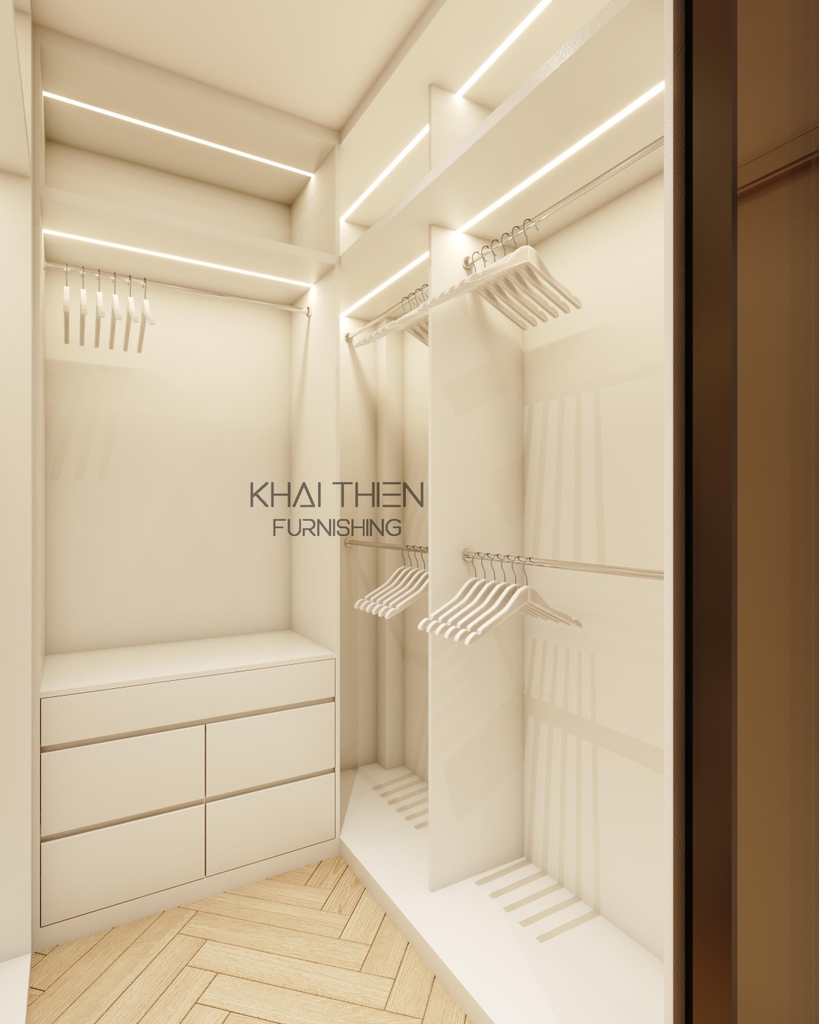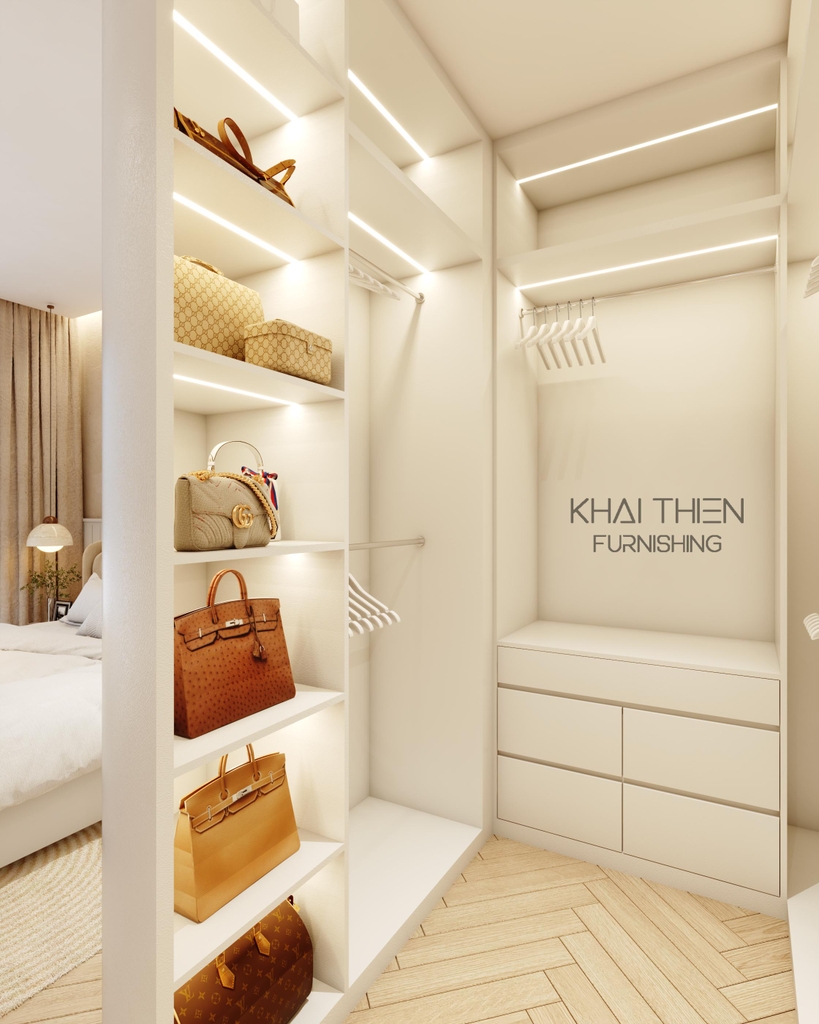 - Kiến trúc sư Nội thất Khải Thiên đã thiết kế một hệ tủ thay đồ tách biệt cao từ sàn đến trần, dọc theo bức tường bên phải cửa ra vào. Để tối ưu không gian và tạo kiểu vòng cung tròn ở các cạnh của mặt hông bên tủ, đồng thời thêm màu trắng kem giống như tường, khiến cảm giác thị giác trở nên hài hòa và thống nhất hơn.