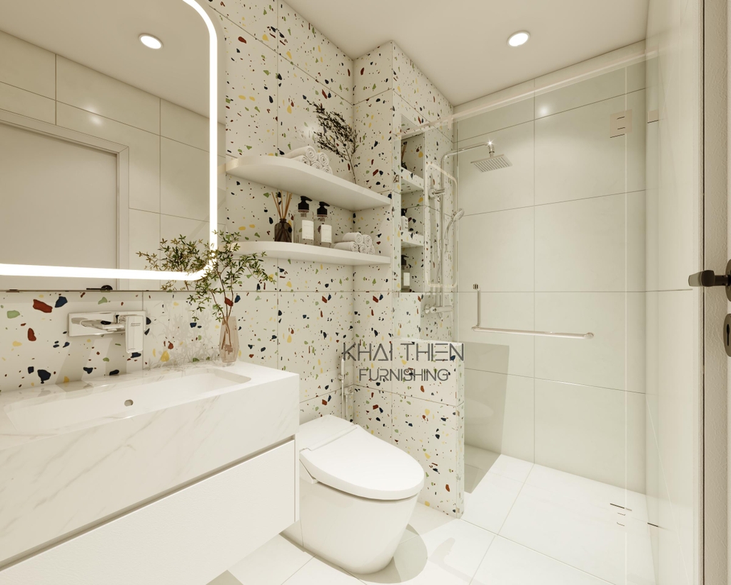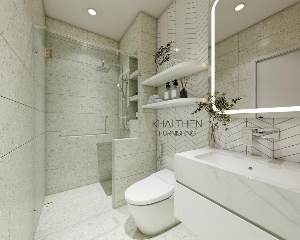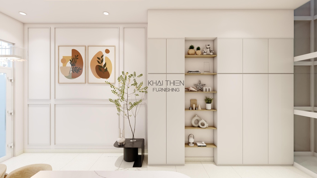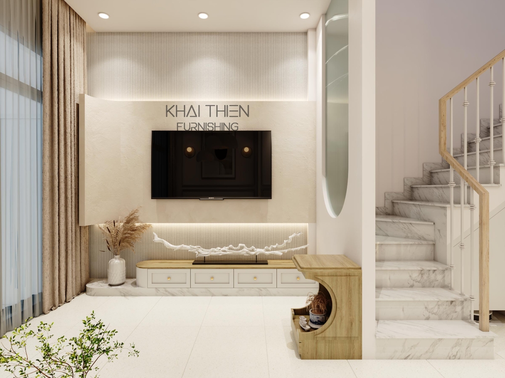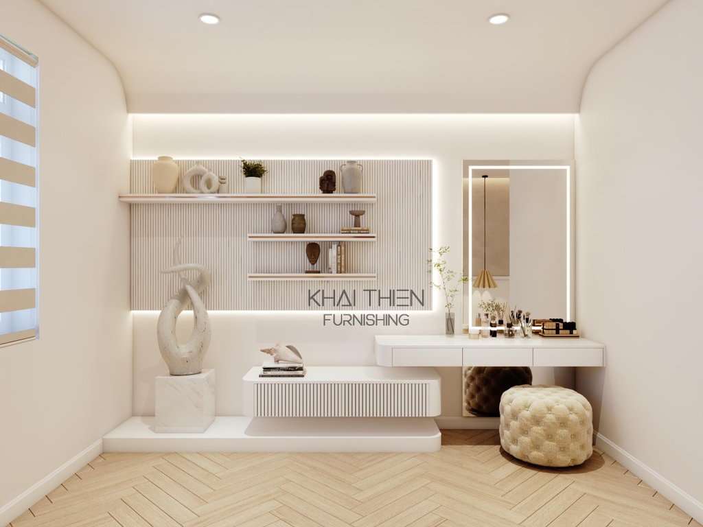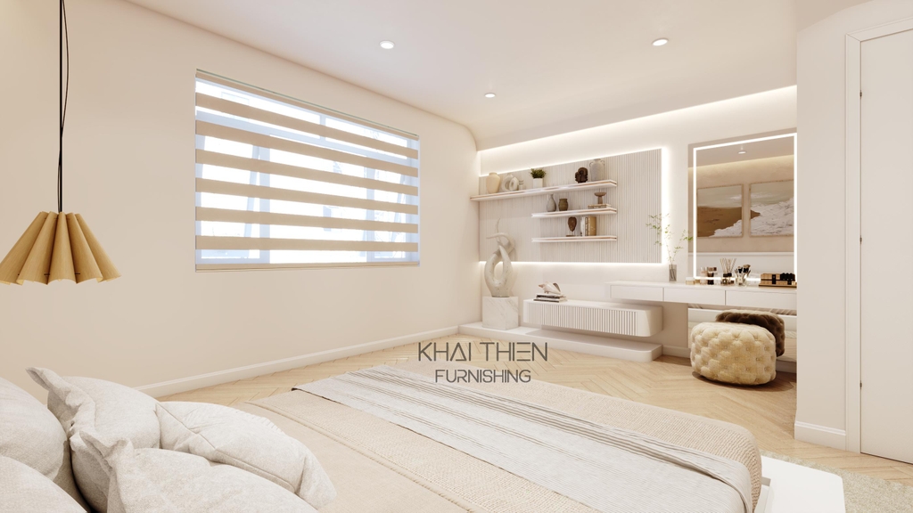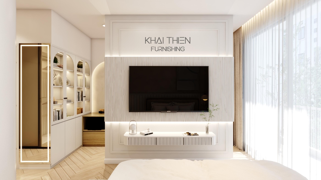 - Khu vực đối diện giường, Nội Thất Khải Thiên đã bố trí 1 hệ vách ốp tivi ngăn tách rời không gian làm việc và khu vực ngủ riêng biệt theo yêu cầu của chủ nhà. Vách ngăn kết hợp kệ tivi và lưu trữ: Thiết kế này giúp tối ưu hóa diện tích sử dụng, vừa có chức năng như một bức vách phân chia, vừa là nơi lưu trữ đồ đạc, tạo nên không gian gọn gàng và tiện nghi.