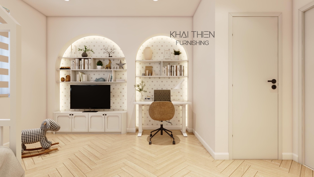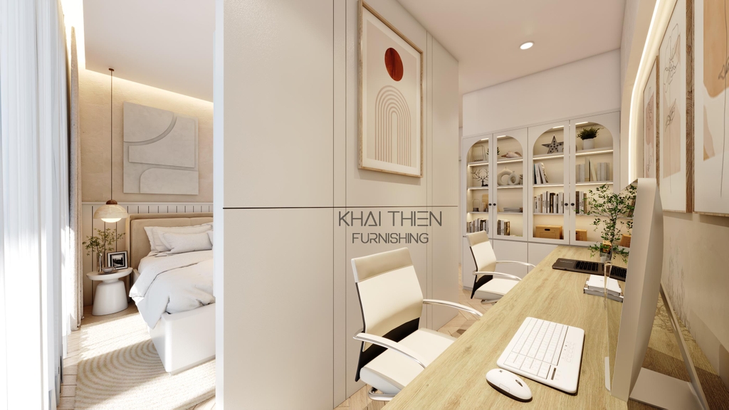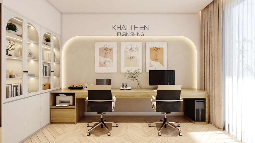 - Bàn làm việc và tủ sách được thiết kế, bố trí rộng rãi cho 2 vợ chồng gia chủ thoải mái làm việc. Nội Thất Khải Thiên đã bố trí hai bàn làm việc sát nhau trên một bức tường dài, tạo thành một không gian làm việc chung rộng rãi. Đặt bàn làm việc cạnh cửa sổ để tận dụng ánh sáng tự nhiên, giúp không gian sáng sủa và thoáng đãng. Cân nhắc sử dụng bàn làm việc có tích hợp hộc kéo, ngăn chứa đồ để tăng không gian lưu trữ.