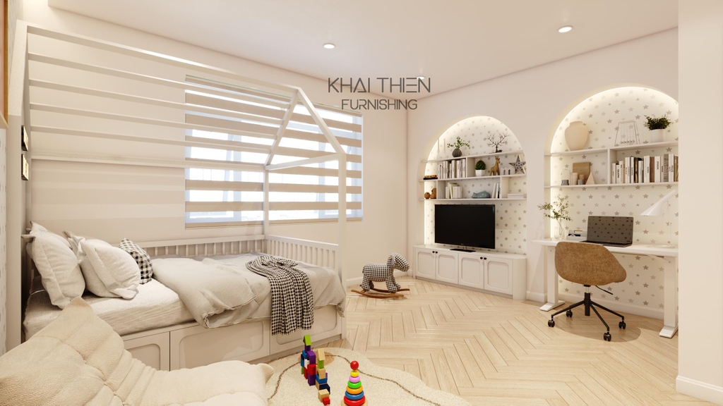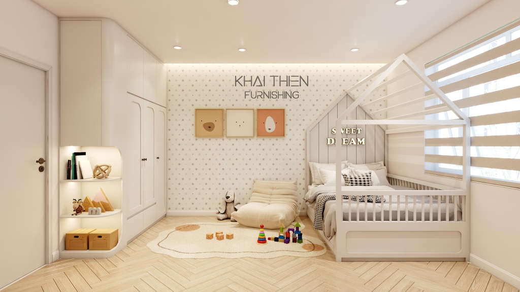- Màu sắc và phối cảnh cần phản ánh sở thích của cả hai bé, tạo ra không gian thú vị và độc đáo. Tạo một khu vực chơi và học chung với bàn học, sách và đồ chơi để , tối ưu hóa không gian và khuyến khích sự phát triển toàn diện của cả hai bé. Bằng cách sử dụng kệ treo tường, bạn có thể tận dụng tường trống để trưng bày hình ảnh, tranh vẽ hoặc các đồ trang trí yêu thích.