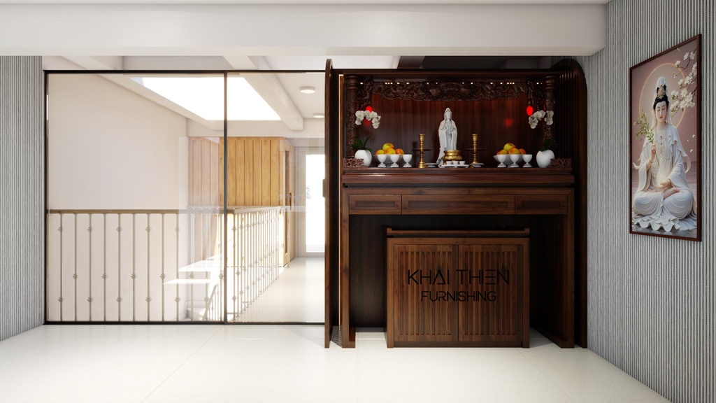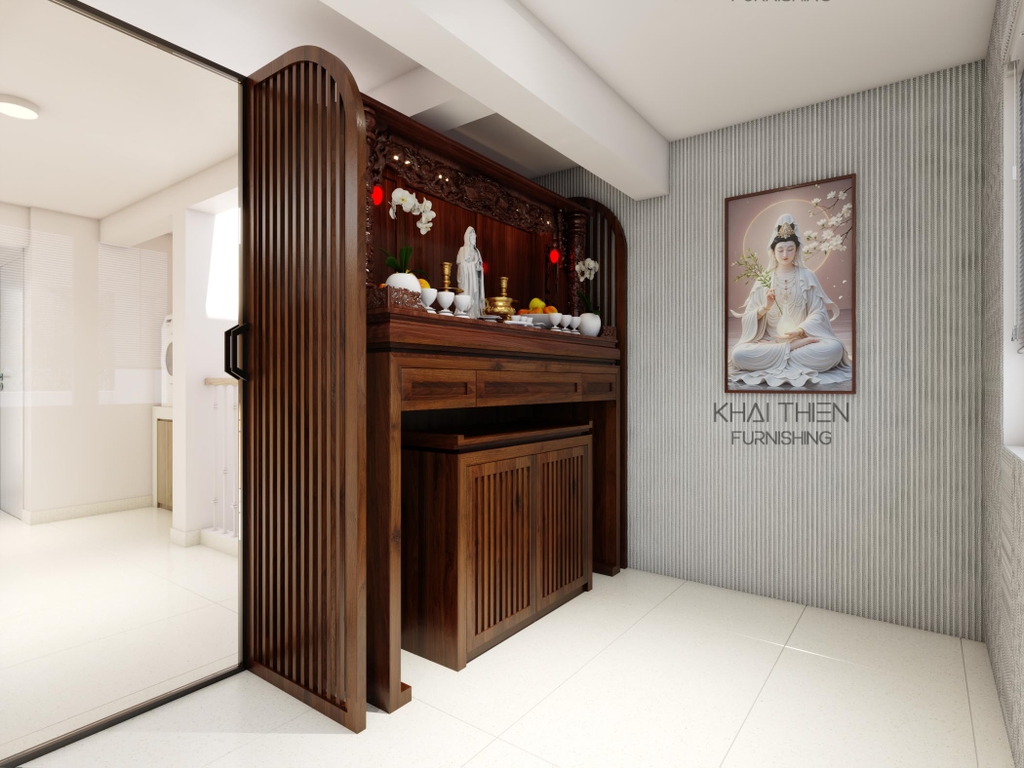 - Tránh các vị trí cấm kỵ: Tuyệt đối không đặt phòng thờ ngay trên phòng ngủ, nhà vệ sinh, hoặc gầm cầu thang vì đây là những không gian không sạch sẽ, ảnh hưởng đến sự trang nghiêm và may mắn.