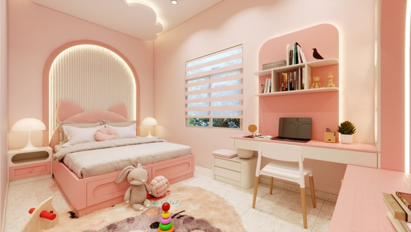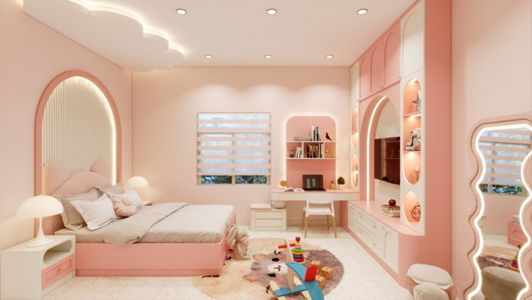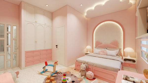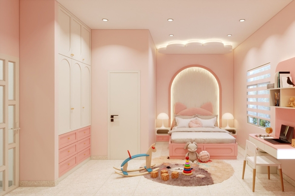 - Mẫu thiết kế phòng ngủ cho bé gái này mang hơi thở nhẹ nhàng, tinh tế trong từng chi tiết. Nội thất phòng ngủ bé gái được phối với 2 gam màu trắng hồng xinh xắn kết hợp cùng thi công trần thạch cao hình đám mây trôi lững lờ mang lại cảm giác ấm áp khiến bé có những giác ngủ ngon và mơ những giấc mơ đẹp.