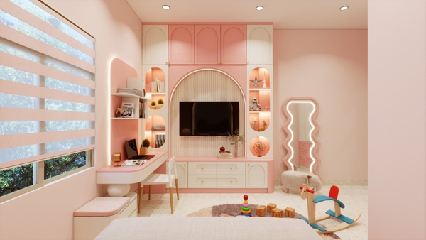 - Một gam màu không bao giờ lỗi thời và đặc trưng là sự dịu dàng, ấm áp. Khi trang trí phòng ngủ với màu hồng pastel chủ đạo cho bé gái, bạn nên ưu tiên lựa chọn các món nội thất có đường nét hiện đại để có thể tạo nên một không gian vừa dễ thương vừa tinh tế.