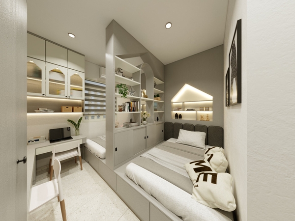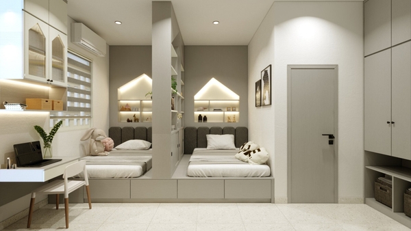 - Với nhiều yếu tố như giới hạn về diện tích, thay vì thiết kế phòng ngủ riêng biệt cho 2 bé thì nay lại có thể thiết kế 2 trong 1 nên sẽ giúp bạn kha khá diện tích và có thể tận dụng không gian trống đó để có thể thiết kế với nhiều công dụng khác.