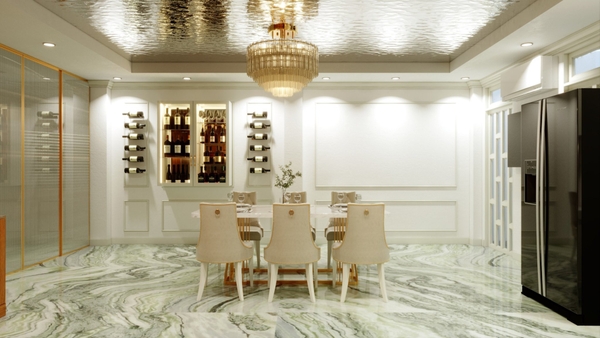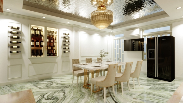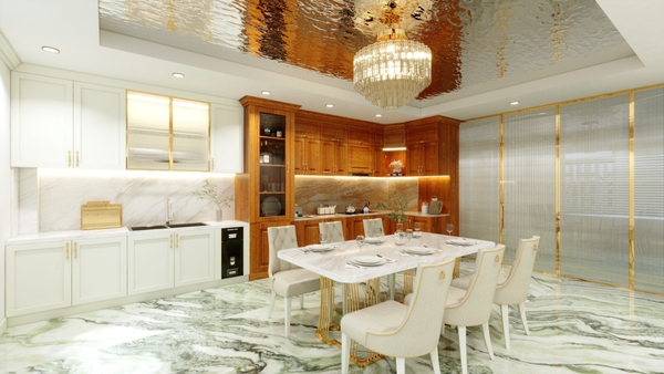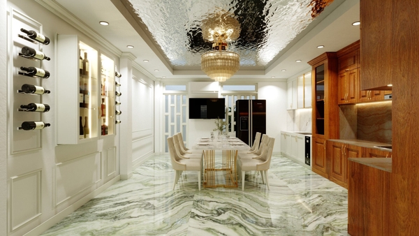 - Bàn ăn được bố trí giữa phòng với kích thước thước dài 2m sâu 90cm và 6 ghế đủ cho số lượng thành viên trong nhà. Bàn ăn được gia công chân inox mạ PVD vàng bóng kết hợp mặt đá Lamra tạo cảm giác sang trọng.