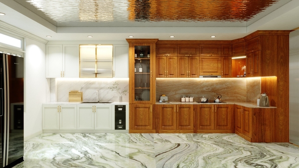 - Phần trần bếp team Khải Thiên thiết kế hệ trần thạch cao kết hợp tấm Than tre giả inox gợn sóng. Tấm ốp than tre mang đến vẻ đẹp tự nhiên với sự kết hợp của màu sắc và hoa văn nhiều họa tiết của công nghệ mới. Mỗi tấm ốp có một đường vân riêng biệt, tạo nên sự độc đáo và sang trọng phù hợp với mọi phong cách thiết kế riêng. Bạn có thể lựa chọn từ những tone màu tự nhiên như nâu, be, đen, vàng, xám, bạc, ánh kim,….hoặc thậm chí vân kim loại, vân vải, vân giấy, vân sóng nước, và không thể thiếu là vân gỗ để tạo nên sự sang trọng và phong cách riêng của bạn.