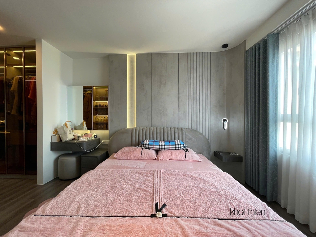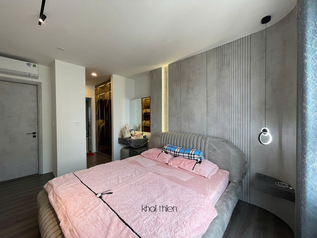- Khác với Phòng khách bếp được gia chủ đầu tư khá nhiều trang thiết bị và nhiều hệ tủ cánh kính cao cấp, Phòng ngủ Master gia chủ muốn decor giản đơn nhưng vẫn giữ được phong cách hiện đại.