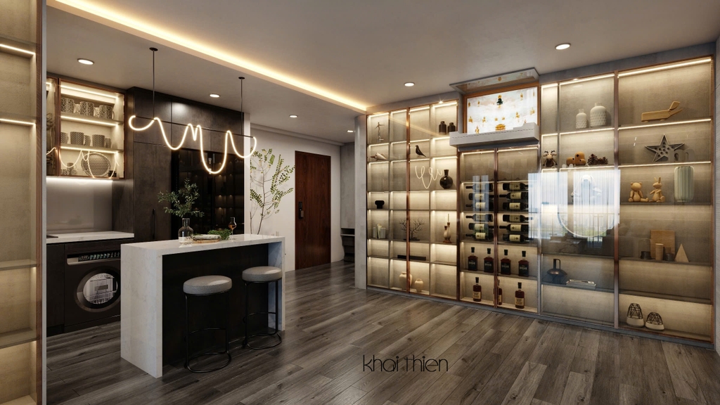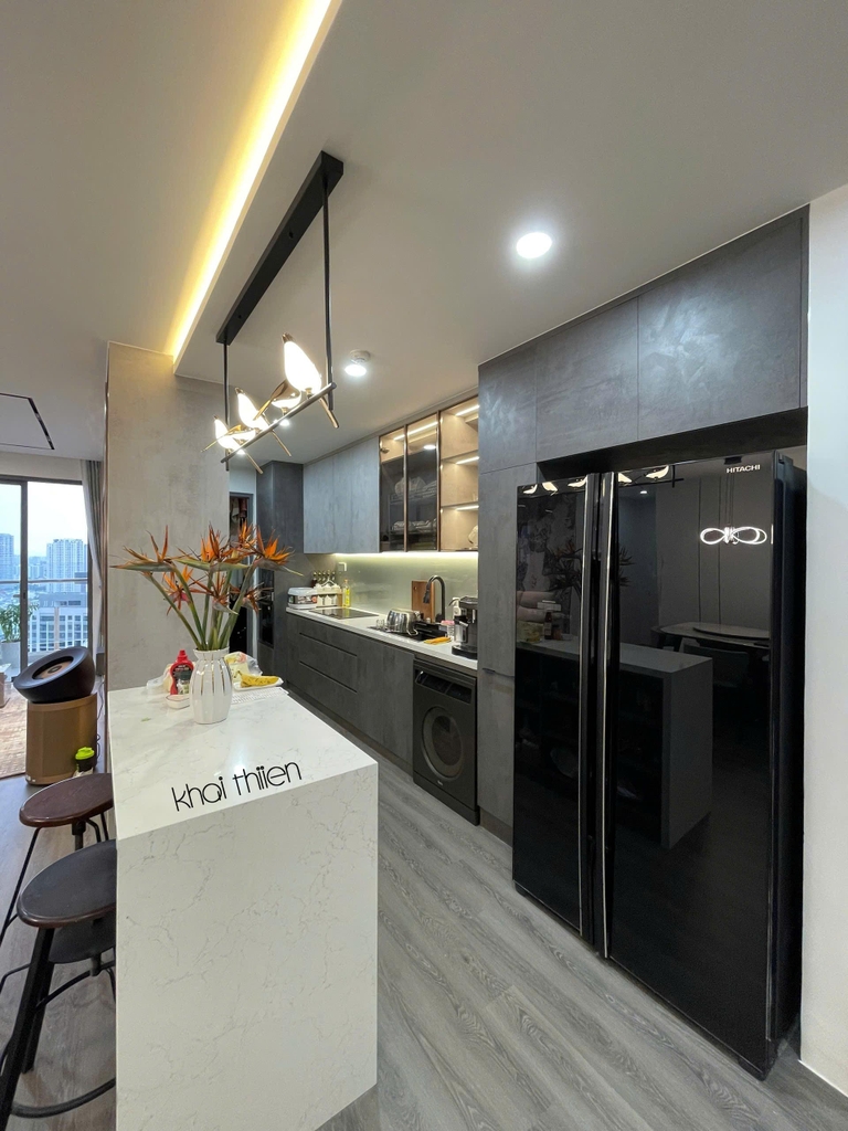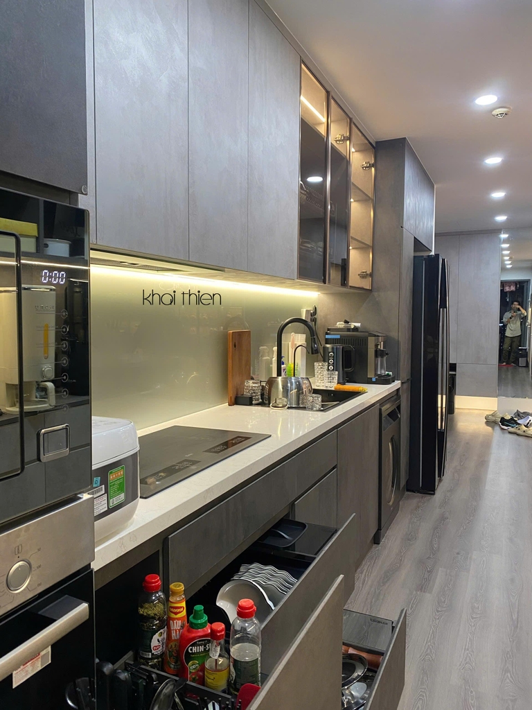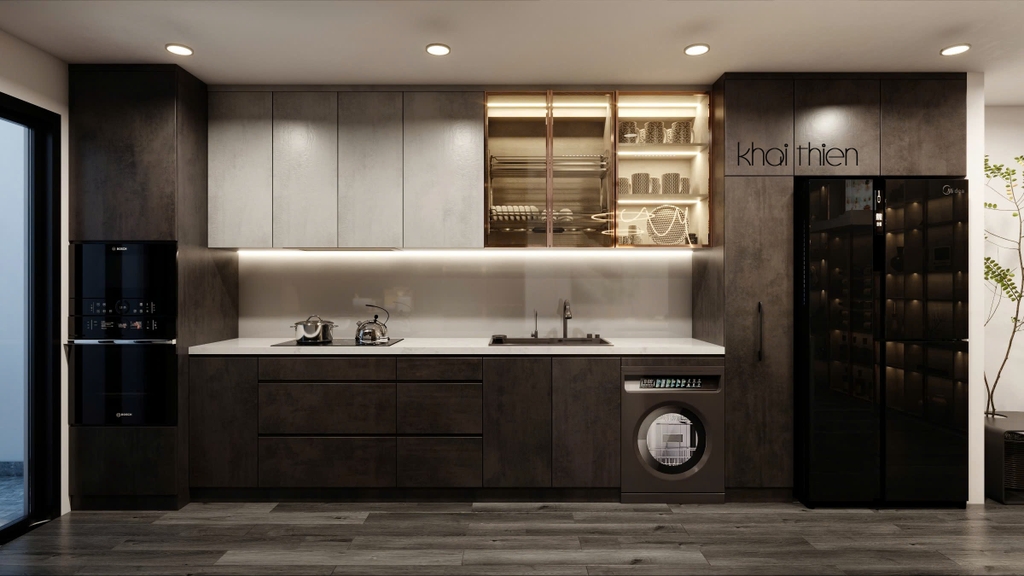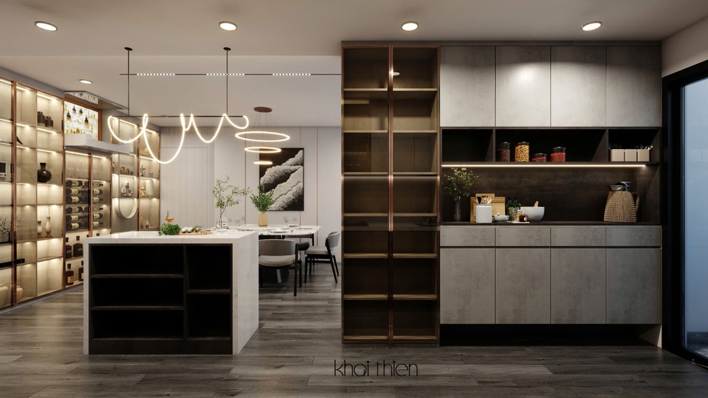 - Để đáp ứng nhu cầu sử dụng nhiều thiết bị điện tử và bếp của gia chủ, Nội Thất Khải Thiên đã thiết kế một hệ bếp song song gồm bếp chữ I và một tủ đồ khô kết hợp bếp đảo, giúp tăng khả năng lưu trữ và tiện nghi cho khu vực nấu nướng.