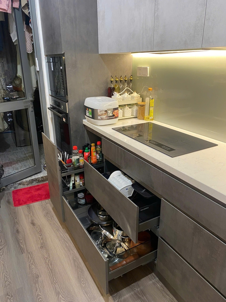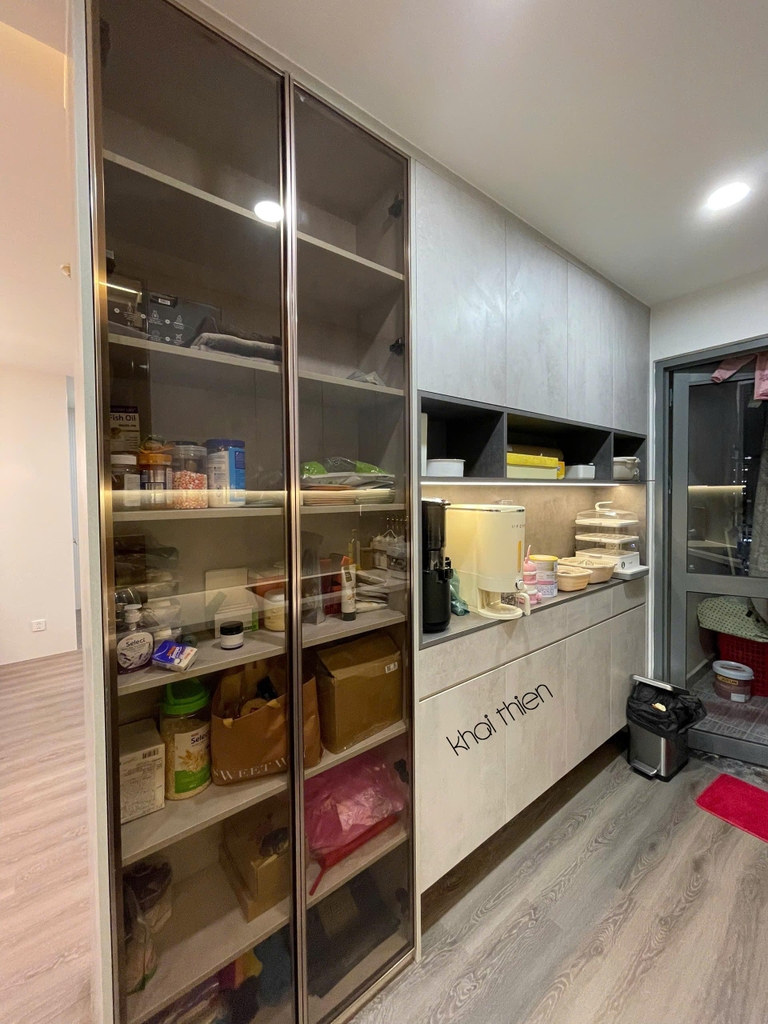 - Bếp chữ I cung cấp không gian nấu chính, trong khi bếp đảo và tủ đồ khô đảm nhận chức năng lưu trữ thiết bị, đồ dùng nhà bếp, và khu vực sơ chế, tận dụng tối đa không gian và tạo sự thuận tiện cho gia chủ. Bếp đảo vừa đóng vai trò như một khu vực chuẩn bị thực phẩm bổ sung, vừa là nơi lưu trữ các vật dụng, thiết bị nhỏ khác, đồng thời có thể tích hợp thêm các thiết bị điện tiện lợi