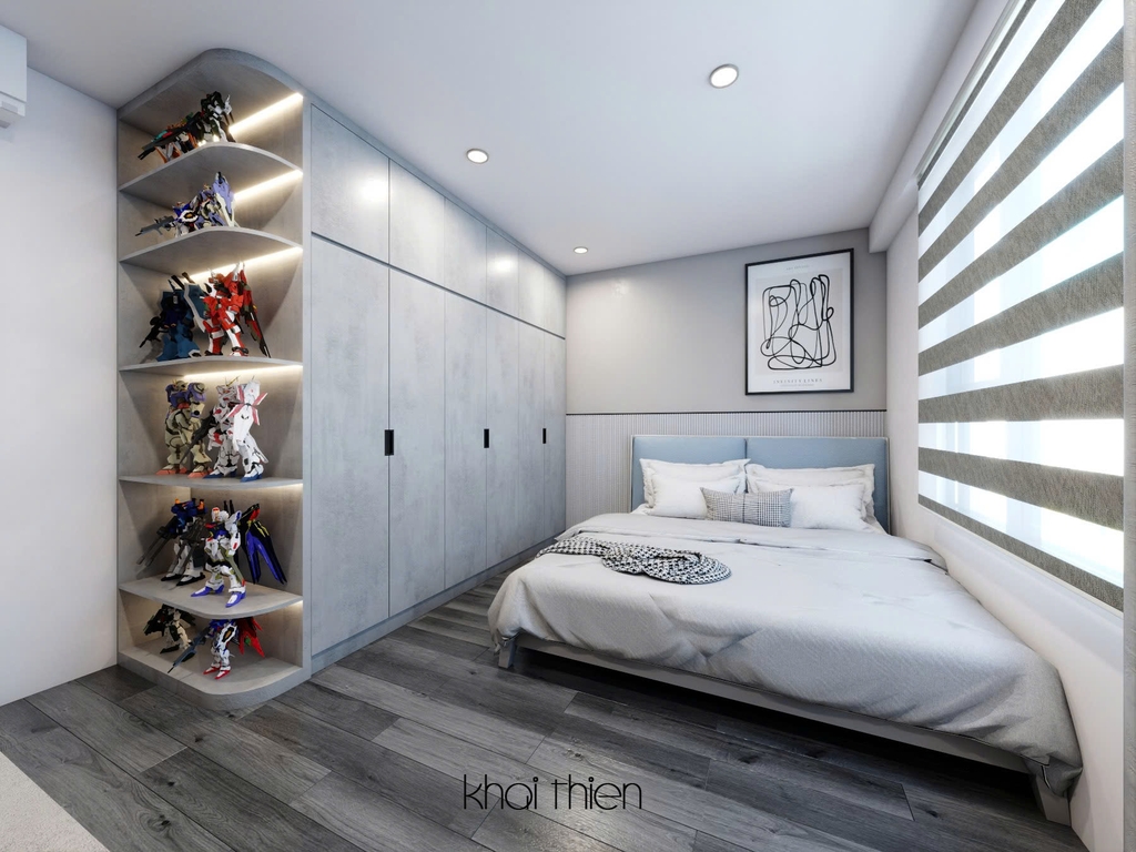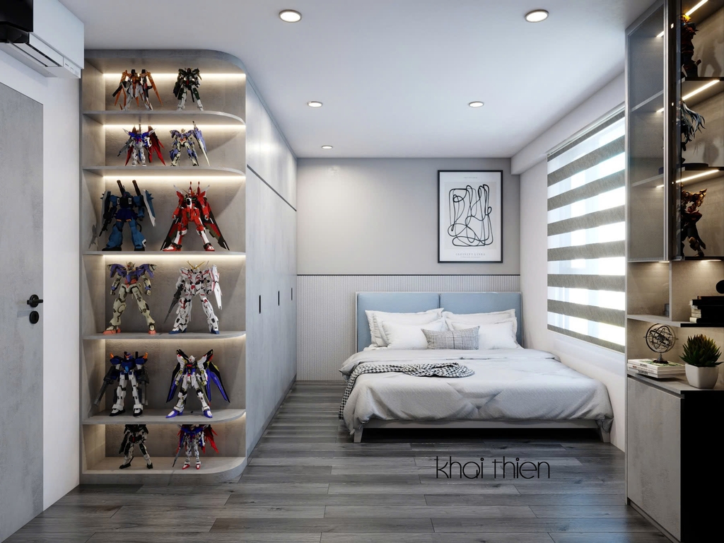 - Để thiết kế phòng ngủ bé trai với nhiều mô hình trưng bày, bạn nên sử dụng các giải pháp kệ treo tường hoặc kệ trưng bày chuyên dụng để tối ưu diện tích, lựa chọn vật liệu nhẹ, an toàn, thiết kế màu sắc tươi sáng, chủ đề yêu thích, đồng thời kết hợp với hệ thống chiếu sáng phù hợp để làm nổi bật các mô hình.