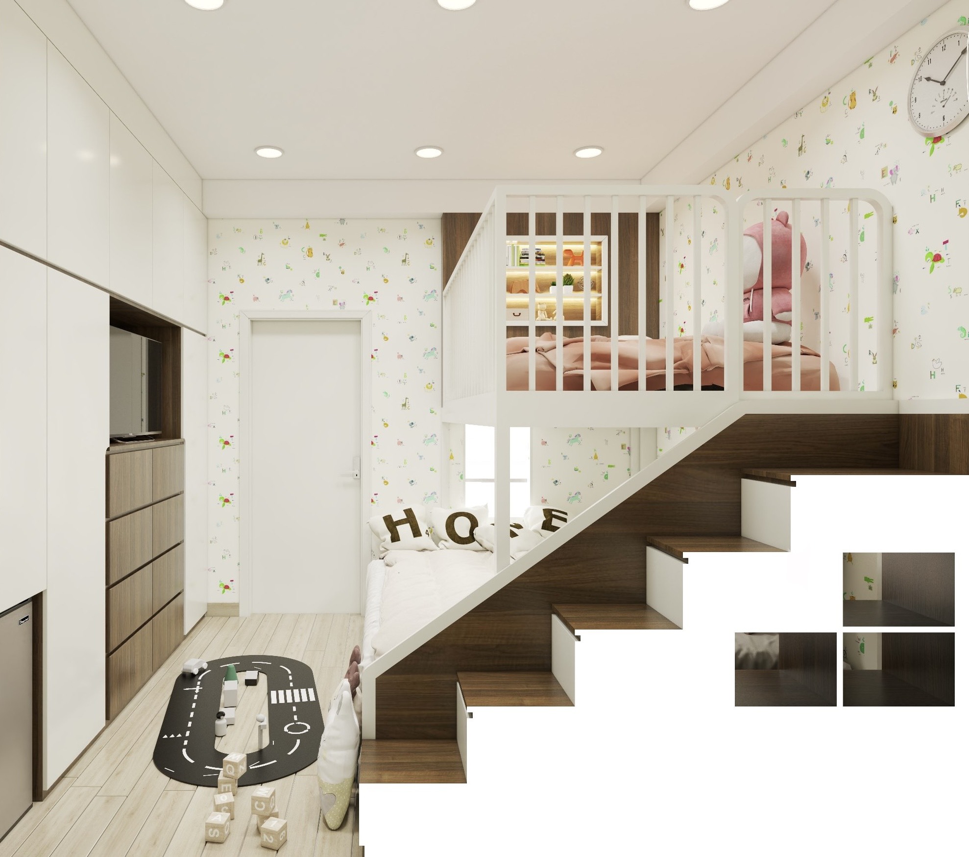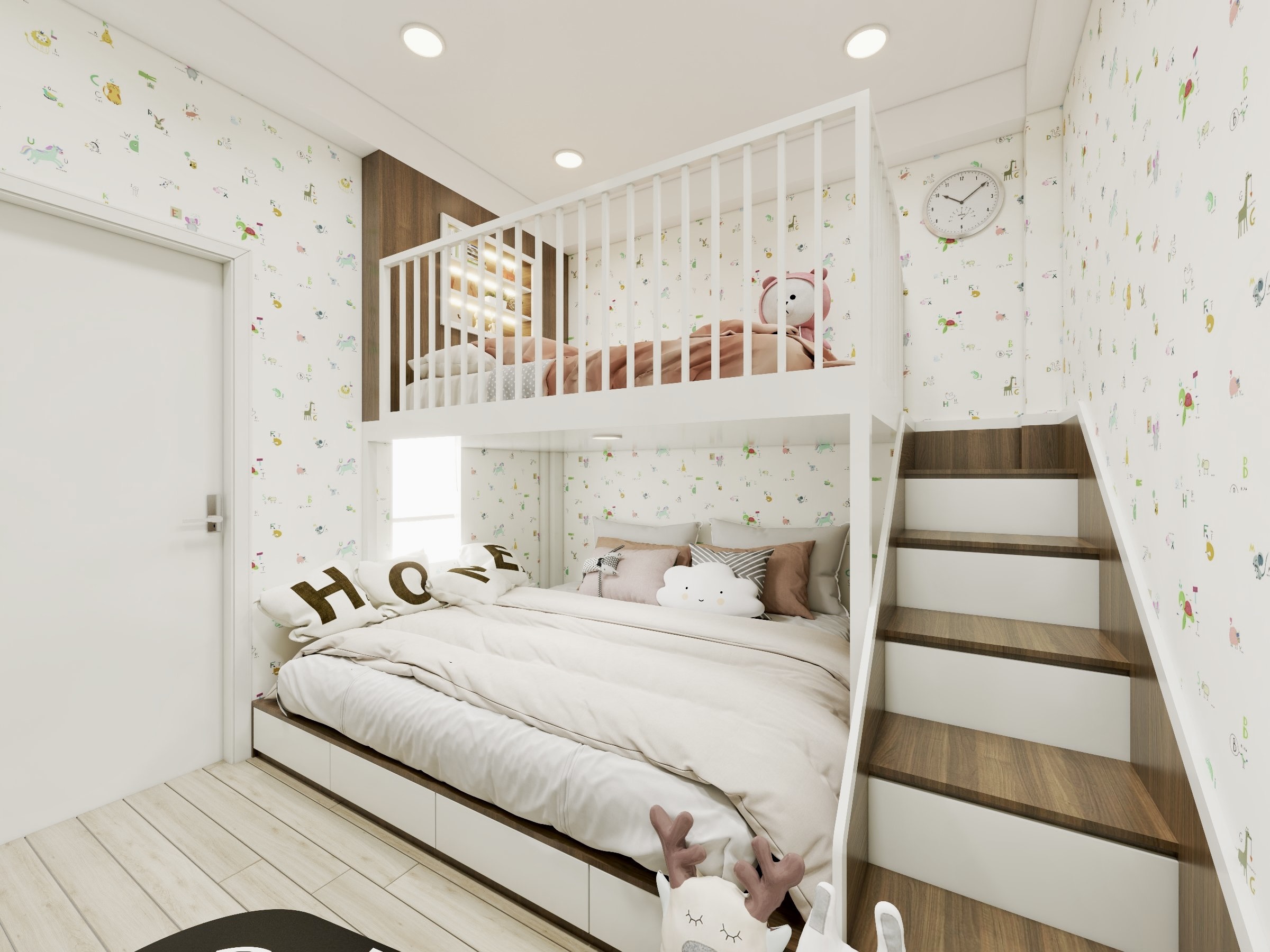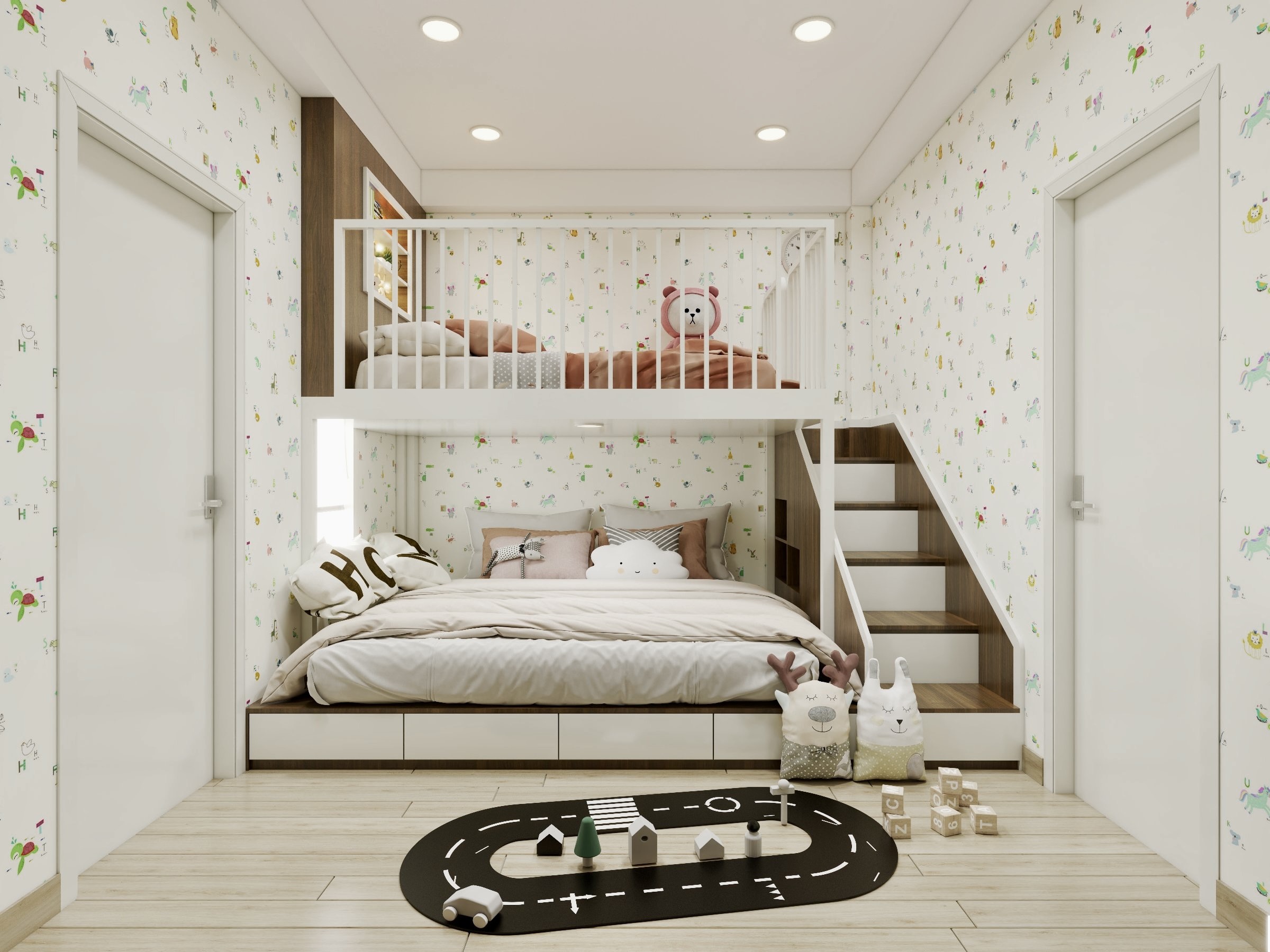 Với những căn phòng có diện tích không lớn mà cần dùng cho 2 bé con, thì phương án sử dụng giường tầng là tối ưu hơn cả.